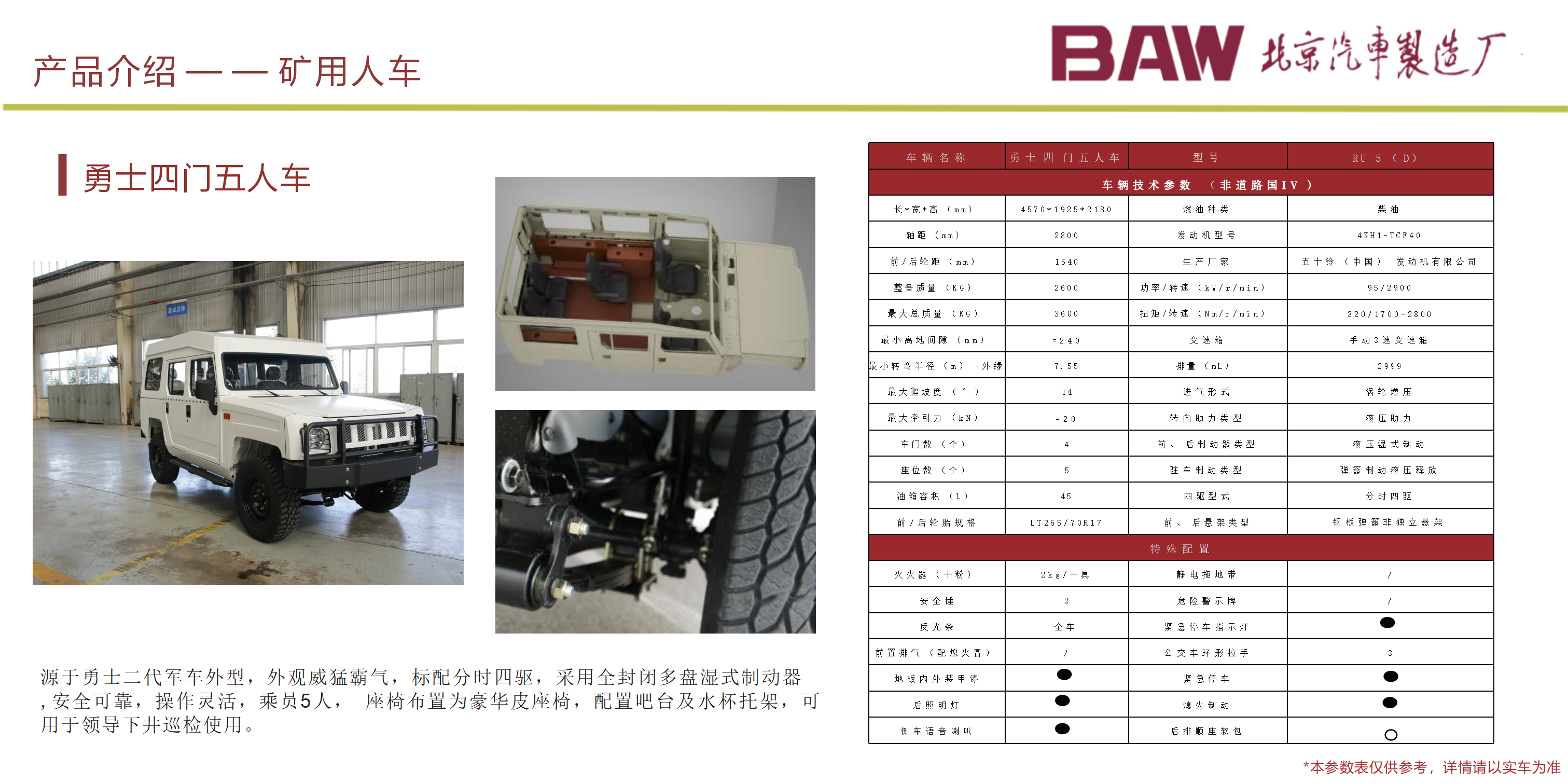 主要用于井下人員的運(yùn)輸 , 以柴油機(jī)為動(dòng)力,適應(yīng)能力強(qiáng); 1、 適用于 3m×3m 巷道斷面的井下運(yùn)輸作業(yè); 2、整車具有耐碰撞性能高、油耗低、綜合運(yùn)行成本低、操作簡(jiǎn)單,乘座舒 適,結(jié)構(gòu)合理,維修、保養(yǎng)容易等諸多優(yōu)點(diǎn); 3、主要電器元件如控制器、液壓、傳動(dòng)系統(tǒng)的關(guān)鍵部件均采用國(guó)內(nèi)外知名 品牌廠家元件,性能可靠; 4、制動(dòng)系統(tǒng)為濕式制動(dòng),彈簧制動(dòng),液壓釋放,安全性能更高;