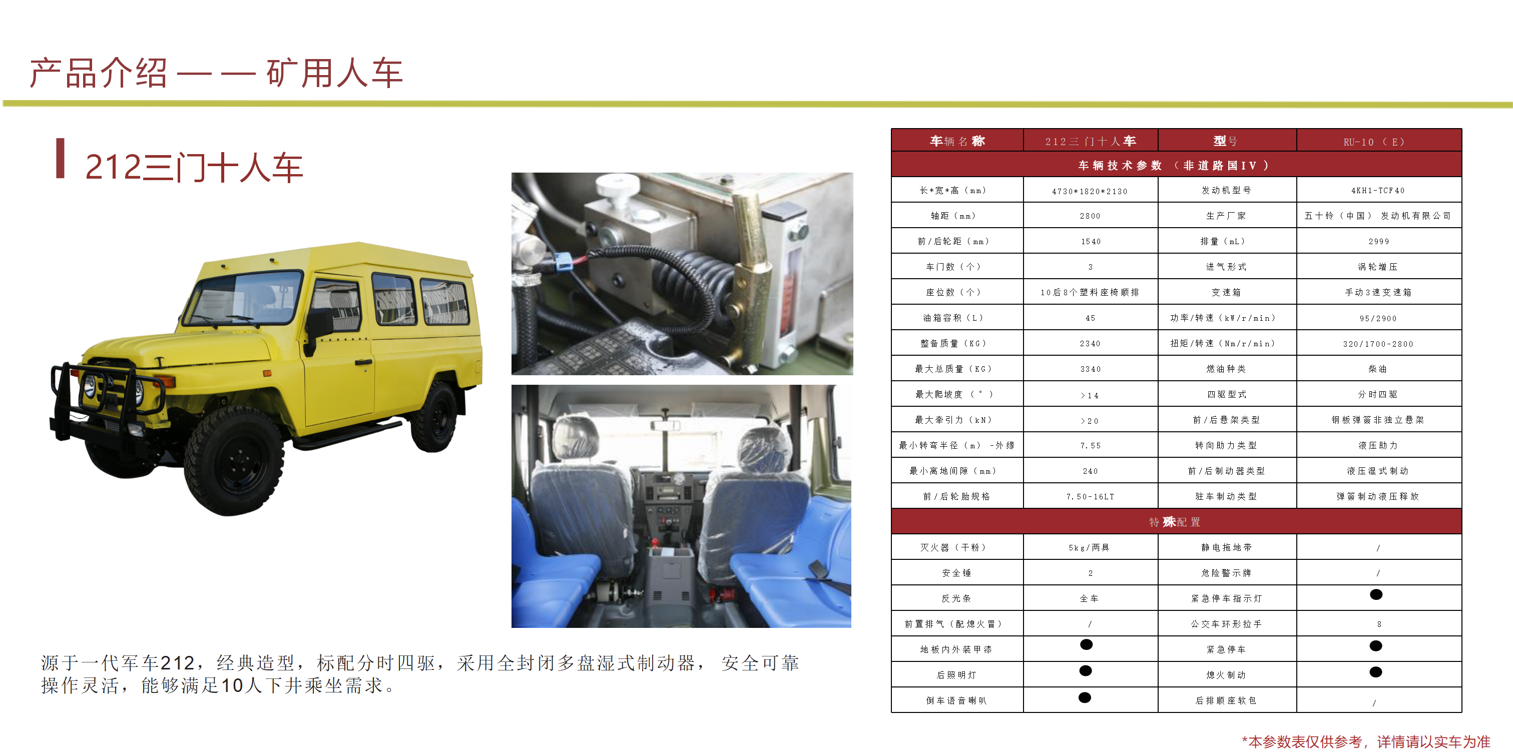 礦安系列車型均符合國(guó)家安全法律法規(guī)要求,具備礦安認(rèn)證文件,已開發(fā)及即將開發(fā)的車型有10、15、19人運(yùn)人車輛及材料車、炸藥車等。 配備國(guó)三江鈴、玉動(dòng)及國(guó)四慶鈴發(fā)動(dòng)機(jī)